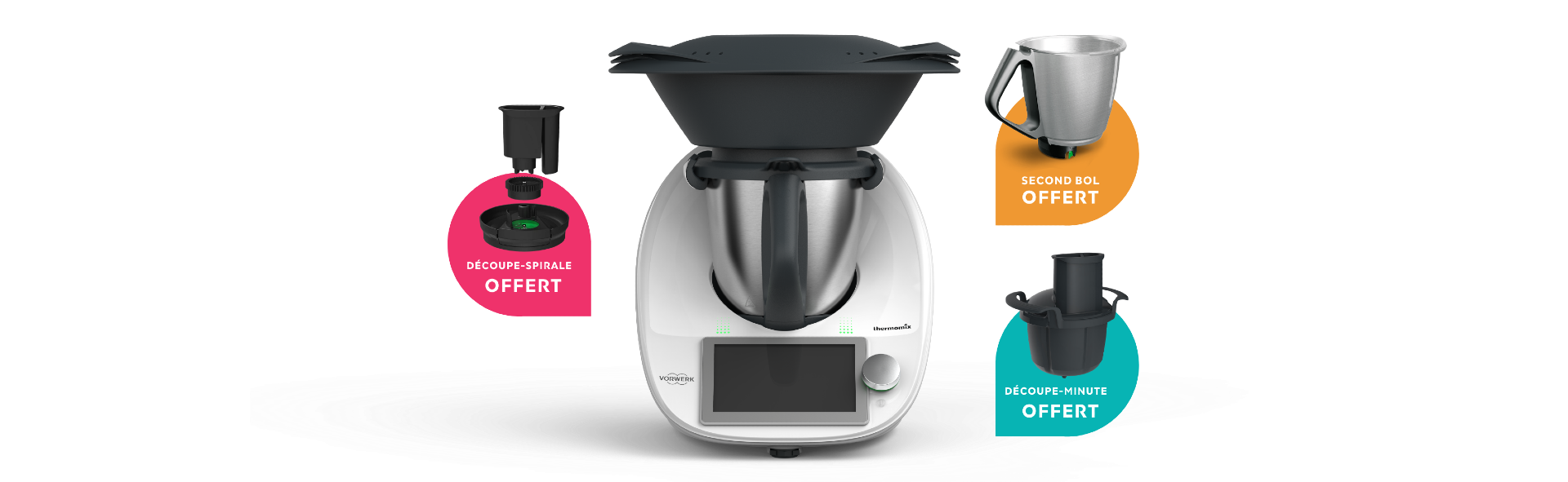 Thermomix® TM6 à 1849 € avec 483 € de cadeaux offerts : un bol supplémentaire, un découpe-minute et un découpe-spirale pour cuisiner plus vite et plus malin.